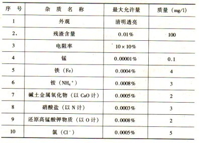 蓄電池用水的標(biāo)準(zhǔn),我國(guó)原第一機(jī)械工業(yè)部對(duì)蓄電池用水的要求見(jiàn)表l-3。表l-3中雜質(zhì)鐵、銨、氯等對(duì)鉛酸蓄電池危害較大,制造廠要從嚴(yán)要求。