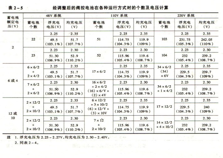 (2)蓄電池的個(gè)數(shù)均少于一般鉛酸蓄電池個(gè)數(shù),對(duì)減少安裝與試驗(yàn)工作、減少工程投資都較有利。根據(jù)表2-4,每個(gè)電池浮充電壓按2.25V,均衡充電電壓2.35V計(jì)算。母線電壓有個(gè)別情況要求偏移電壓范圍較大。為此,可將浮充電電壓作少量增減,對(duì)均充電壓由2.35V降至2.30V,均充時(shí)間可能略為延長(zhǎng)一些。據(jù)一些電池廠試驗(yàn),延長(zhǎng)2~3h,即可達(dá)到均衡充電要求。經(jīng)調(diào)整后的電池個(gè)數(shù)與電壓的計(jì)算,見表2-5。