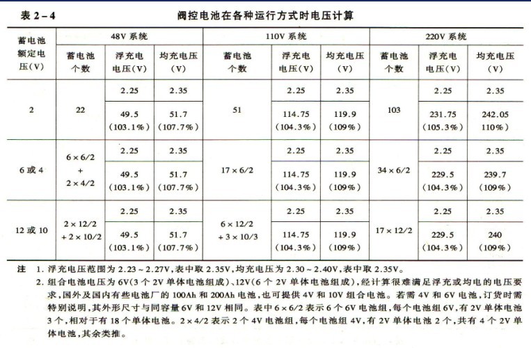 閥控電池在各種運(yùn)行工況時(shí)電壓的計(jì)算,見表2-4。