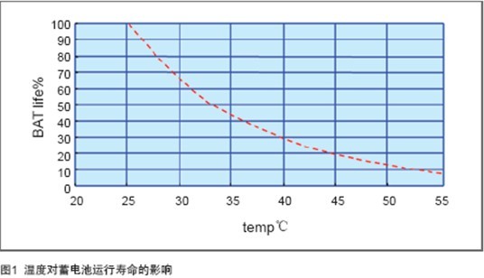 失水的途徑比較多:節(jié)流閥設(shè)計不合理,頻繁開啟;電源對蓄電池頻繁均充;環(huán)境溫度過高。其中高溫是最主要的因素,高溫會加速蓄電池失水速度,導致蓄電池容量下降。以25℃為基準,當蓄電池運行環(huán)境上升10℃,壽命減少50%,如圖1所示。